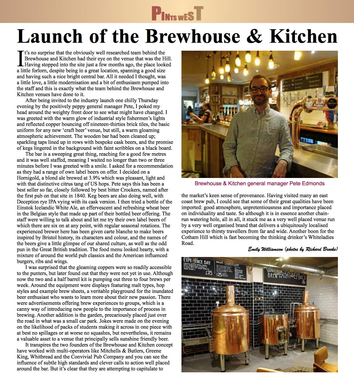 2015 – Author; CAMRA Pints West No. 106, Launch of the brewhouse and kitchen.
